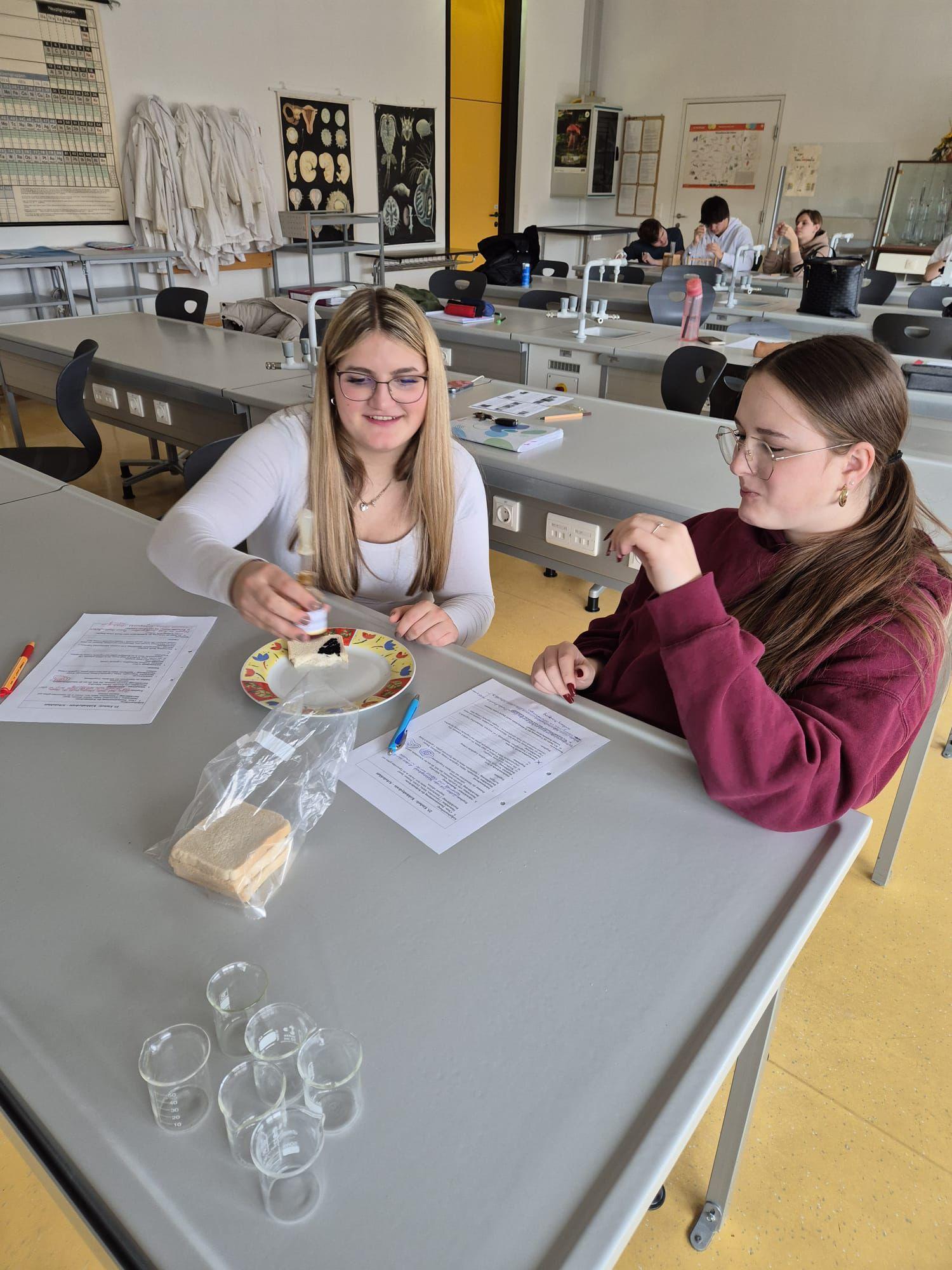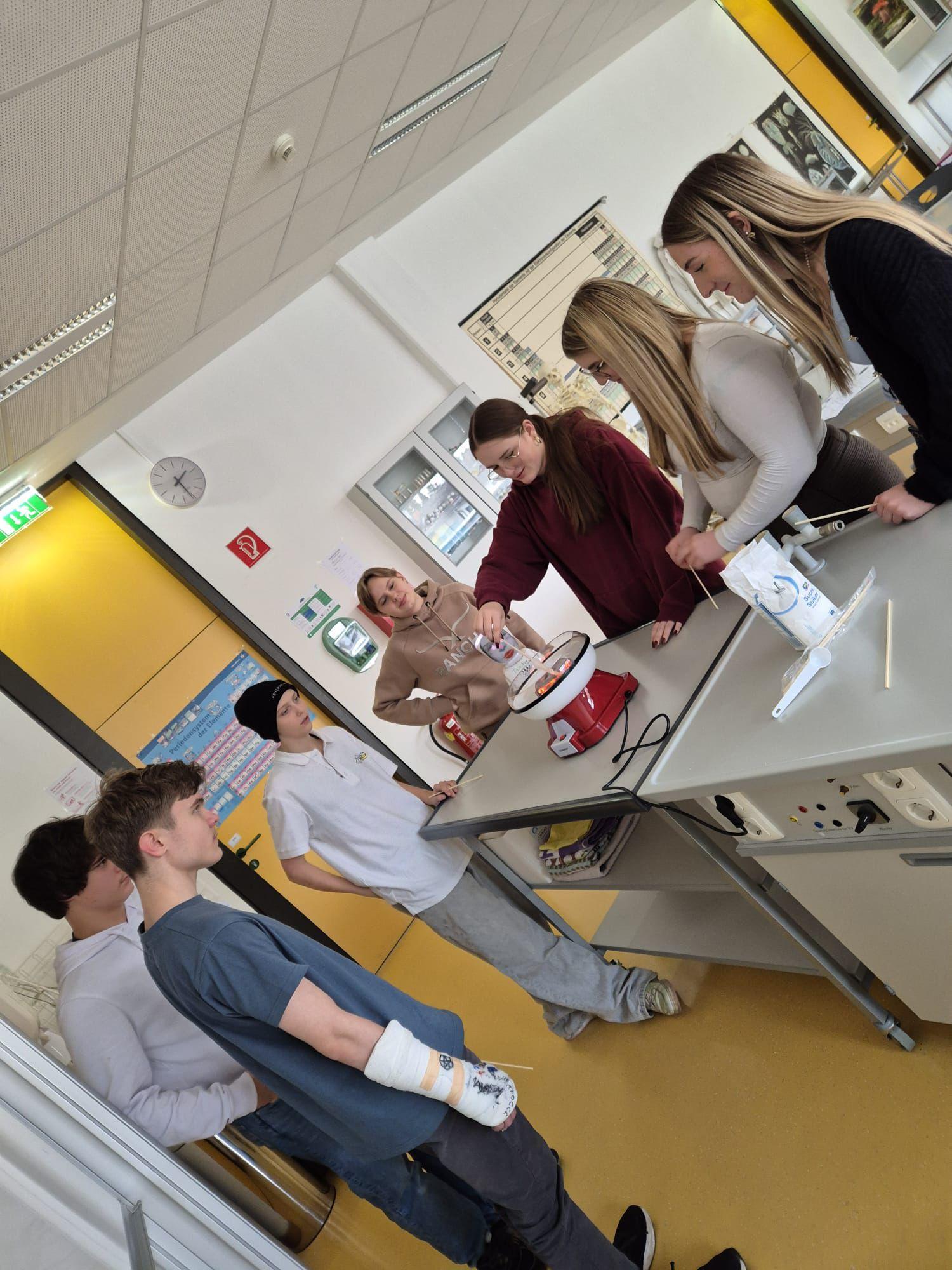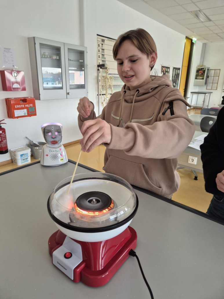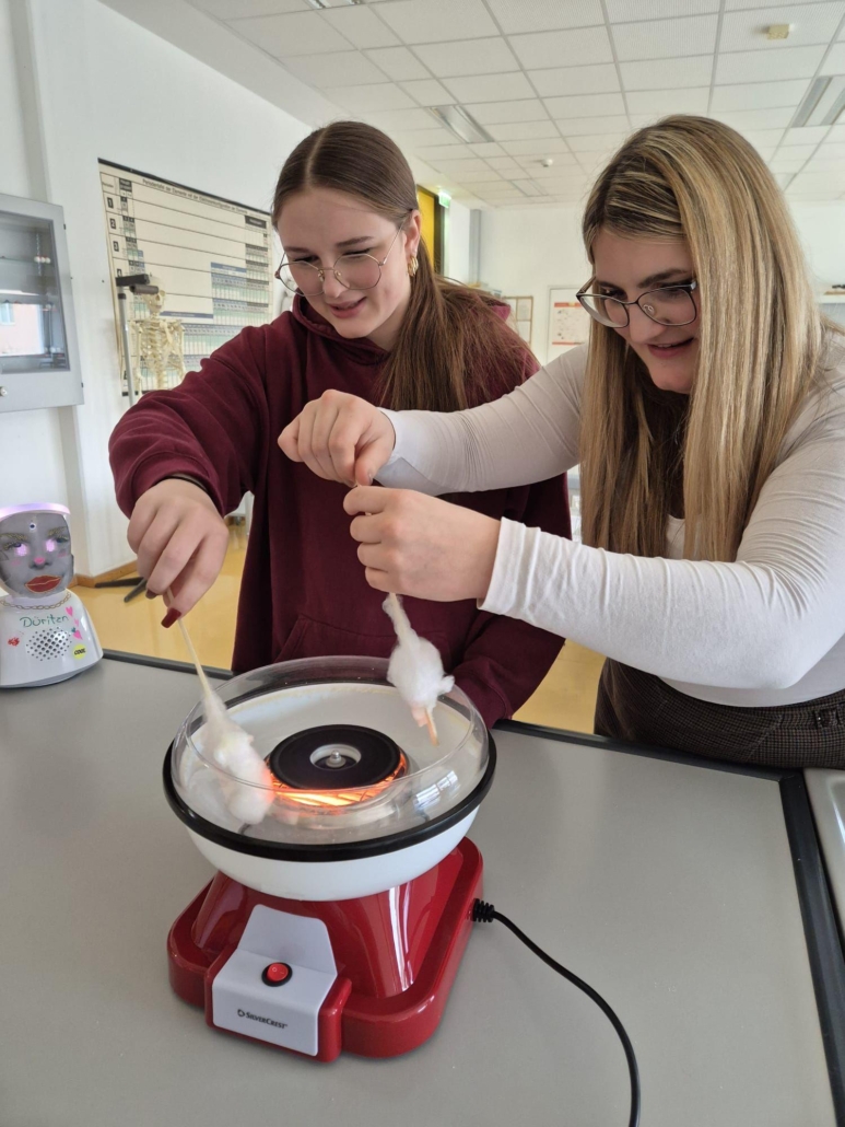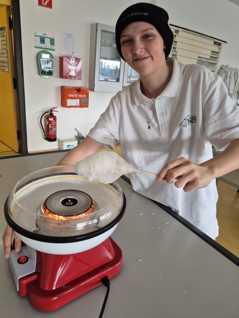 Unsere spannenden Experimente zum Thema Kohlenhydrate umfassten den Stärkenachweis in Lebensmitteln mit Iodlösungen und die Enzymwirkung von Speichel auf Stärke. Weiters die Karamellisierung und Verkohlung sowie die Herstellung von Zuckerwatte.